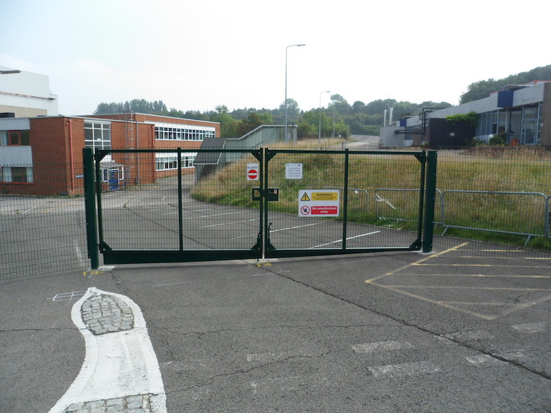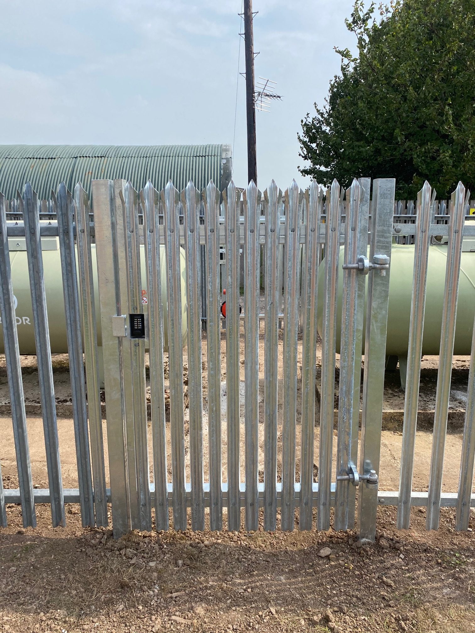 Steel palisade security gates with shrouded locking box and Hi-Viz gate posts in Weston Super Mare