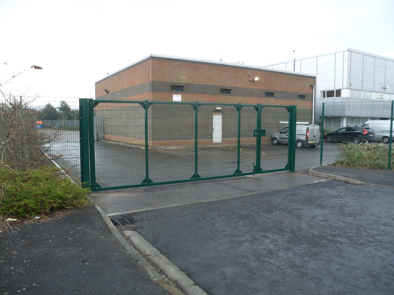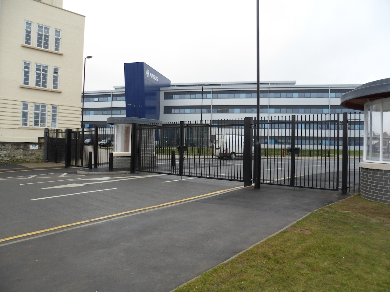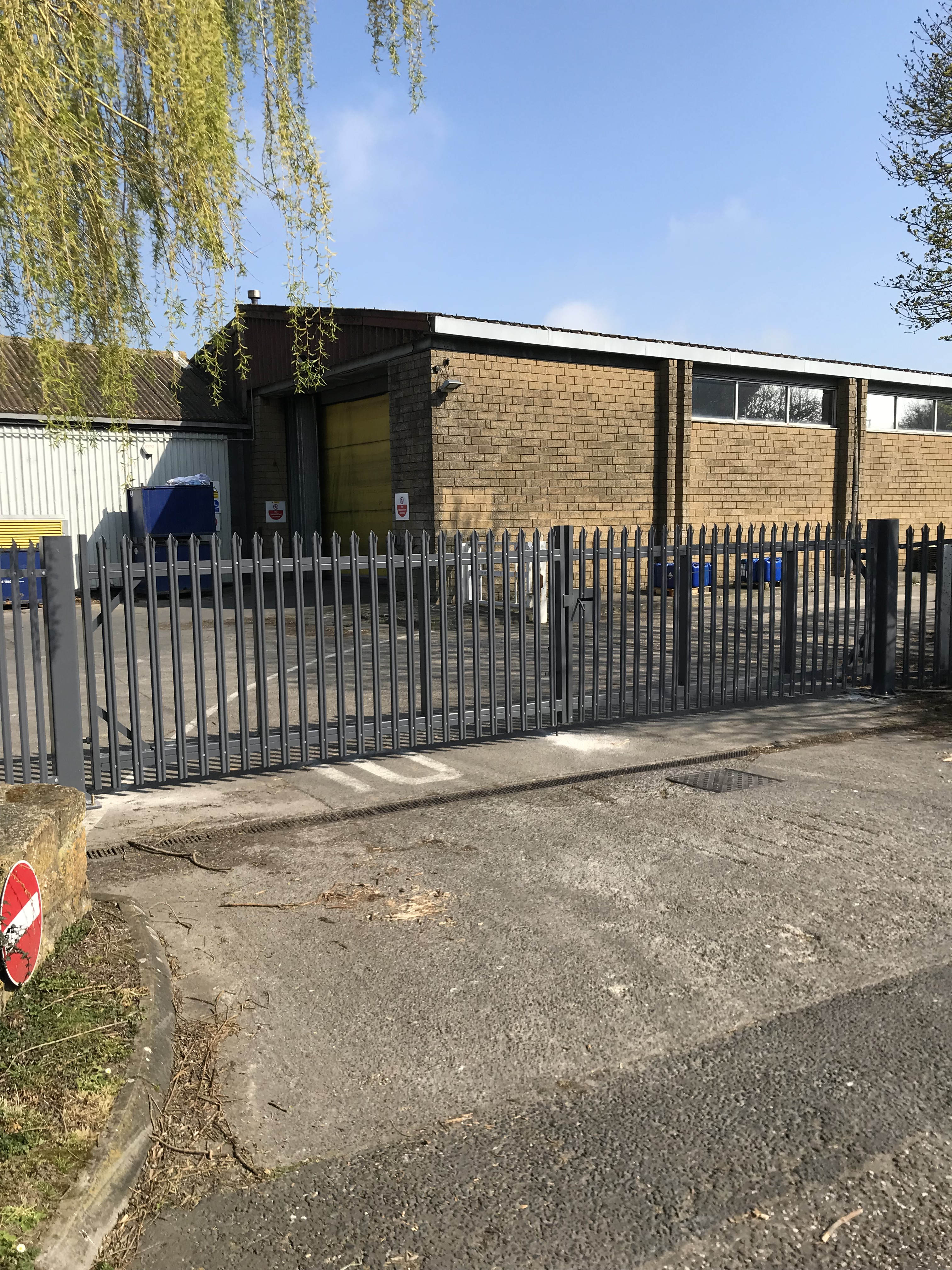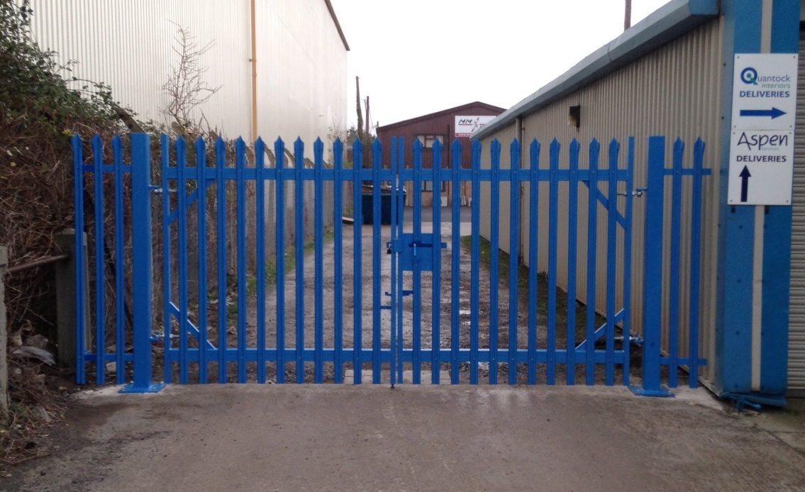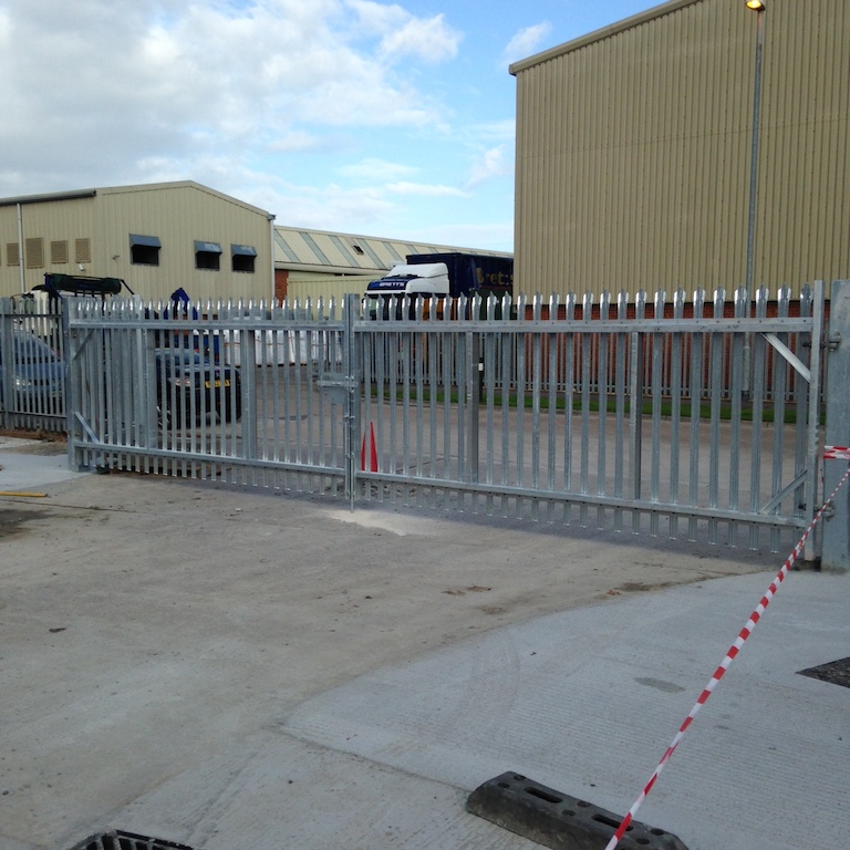 8m wide steel palisade security gates base plated and bolted down to the concrete foundation, factory premises in Ilminster